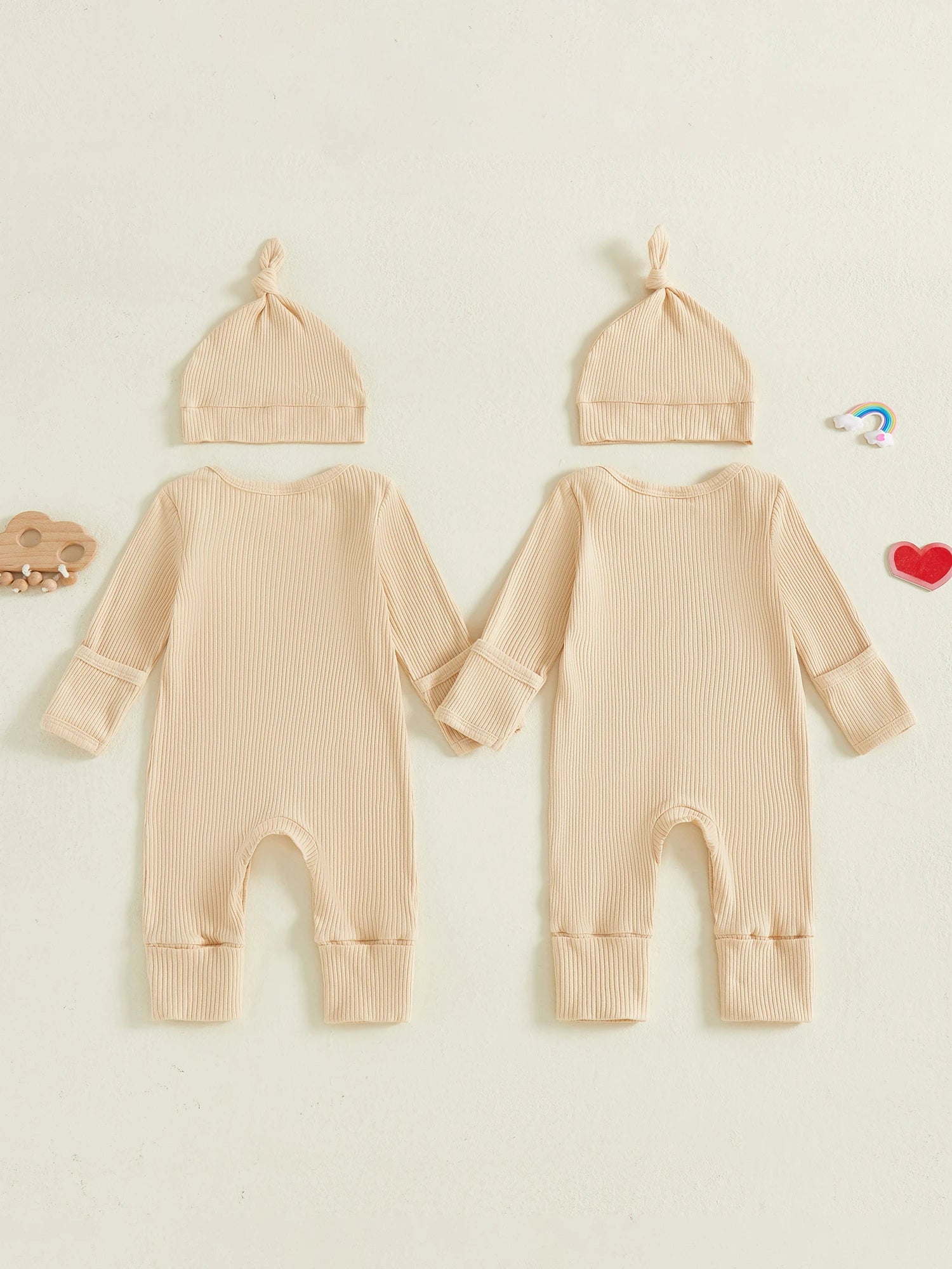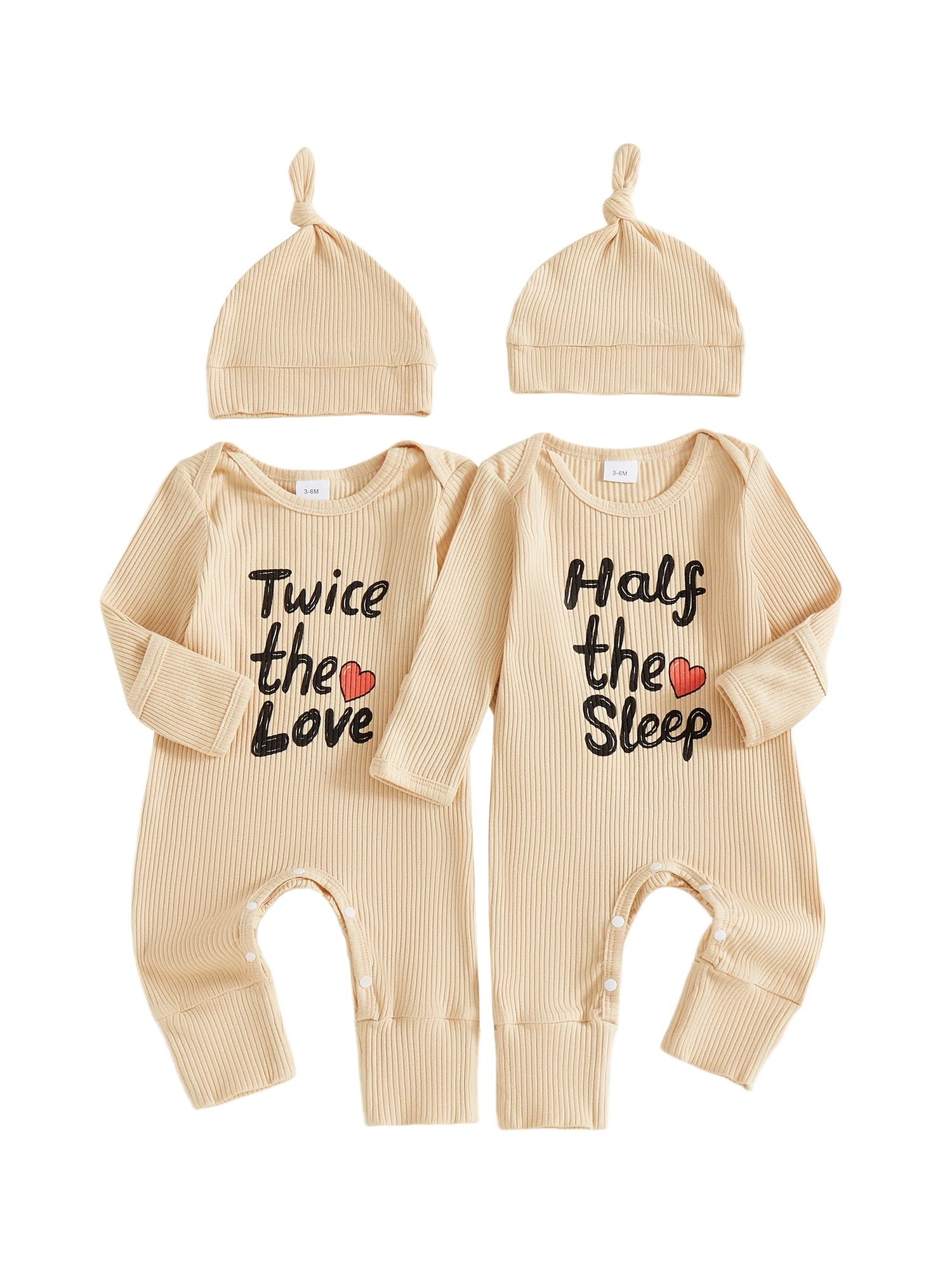 Meet a practical, cozy twin arrival outfit that grows with little ones from newborn days through 12 months. This unisex set includes two long-sleeve rompers with matching hats, designed for comfort during car rides, naps, and cuddles, all in a casual, letters-print style that suits everyday wear.